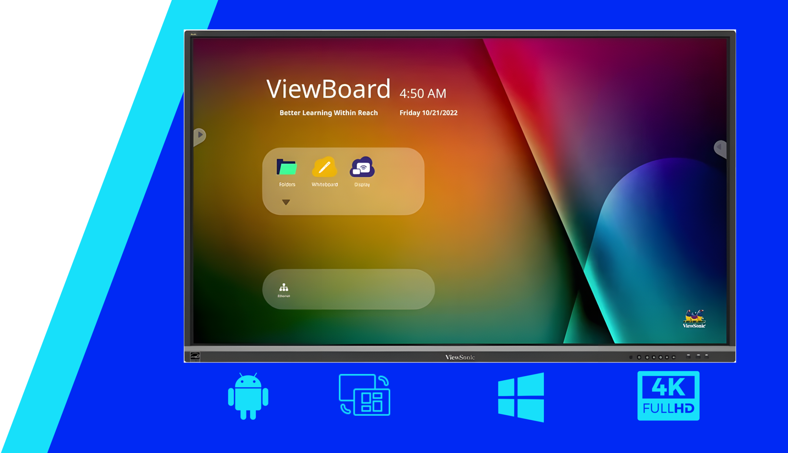 Écran Interactif ViewBoard® 65" 4K Technologie tactile Ultra Fine Touch d'une capacité jusqu'à 40 points de toucher Logiciel de tableau blanc myViewBoard Partage d'écran via USB-C ou sans fil via myViewBoard Display et ViewBoard Cast avec Airplay et Chromecast Contrôle intuitif des appareils à distance et diffusion multimédia avec myViewBoard Manager ​ Système d'exploitation Android 13 Moniteur Interactif 65" Pouces